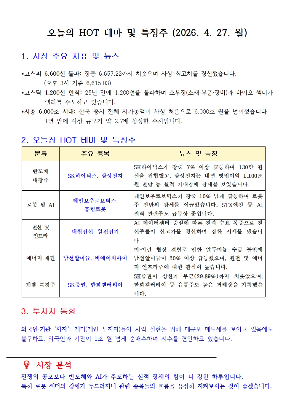 오늘의 HOT 테마 및 특징주 (2026. 4. 27. 월)