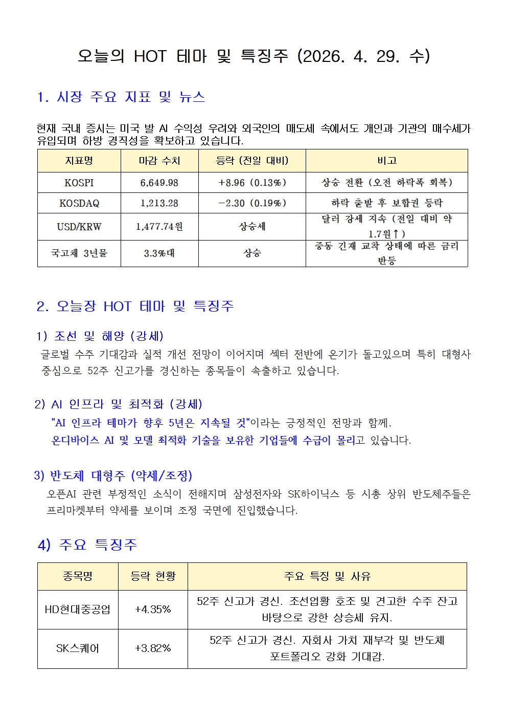 오늘의 HOT 테마 및 특징주 (2026. 4. 29. 수)